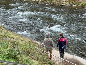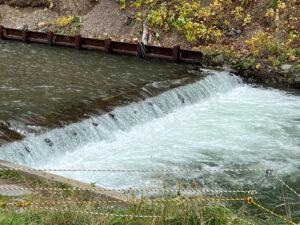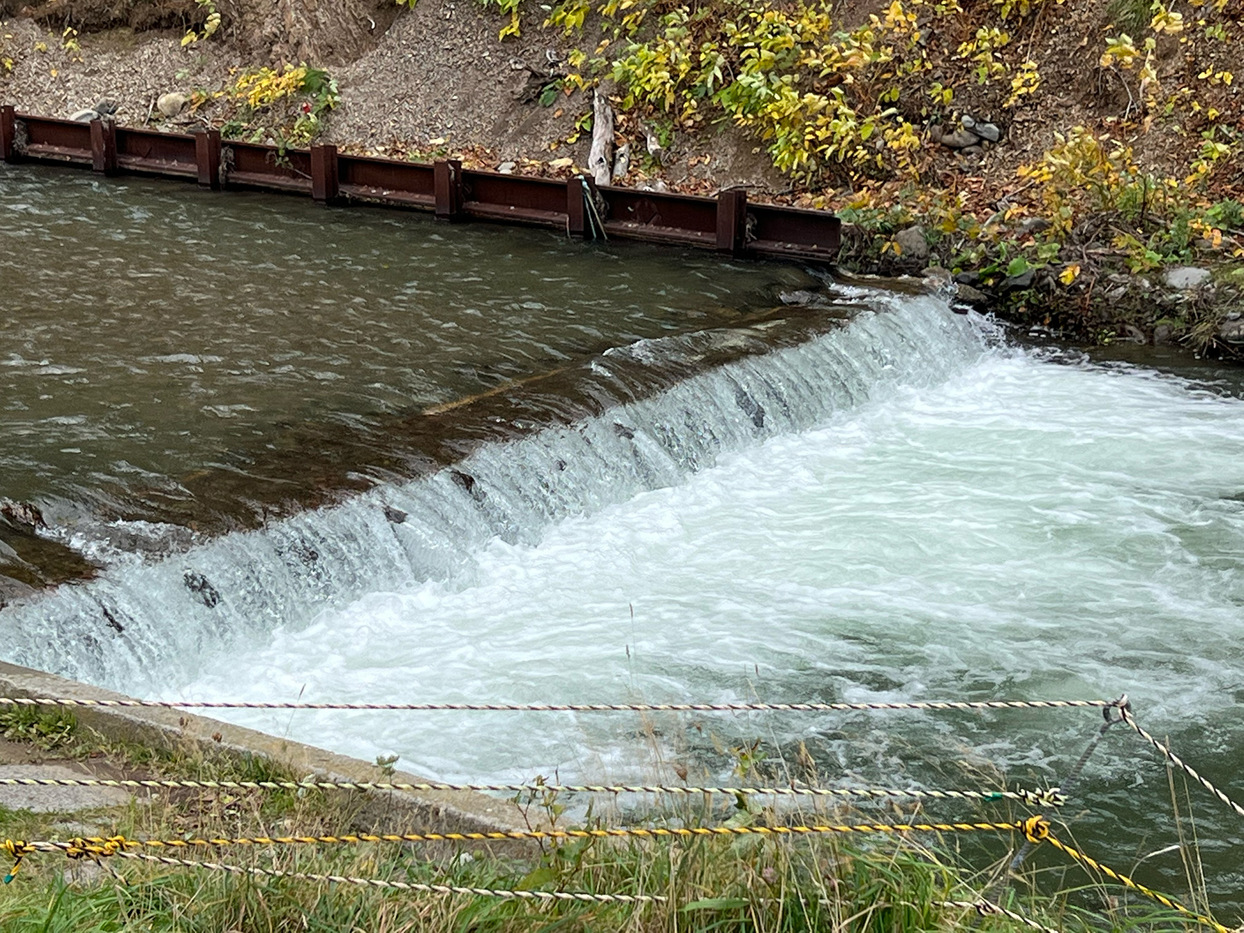 50cmくらいの段差というのか滝というのか堰きというのか分からないけど、シャケが勢いよくのぼろうとしている。